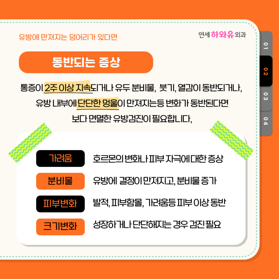 유방에서 멍울이 잡히는 것 외에도 다양한 변화가 동반될 수 있습니다.